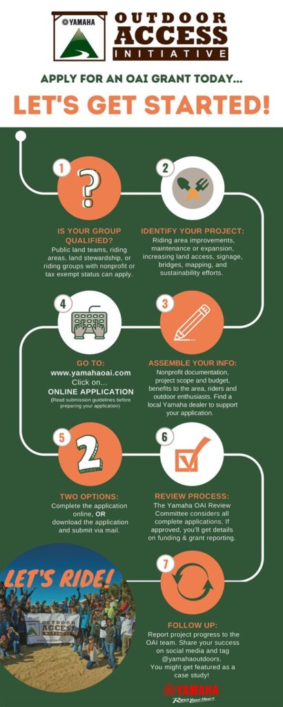 Since 2008, the Yamaha Outdoor Access Initiative has led the powersports industry in supporting responsible access to our nation’s public lands for outdoor enthusiasts. With more than $8 million contributed to over 550 projects across the country, Yamaha has directly and indirectly supported thousands of miles of motorized recreation trails, maintained and rehabilitated riding and hunting areas, improved staging areas, supplied organizations with essential OHV safety education, built bridges over fish-bearing streams, helped children learn to ride bicycles, and partnered with local outdoor enthusiast communities across the country to improve access to public lands. Each quarter, Yamaha accepts applications from nonprofit or tax-exempt organizations including OHV riding and cycling clubs and associations, national, state and local public land-use agencies, outdoor enthusiast associations, and land conservation groups with an interest in protecting, improving, expanding, and/or maintaining access for safe, responsible, and sustainable public use.